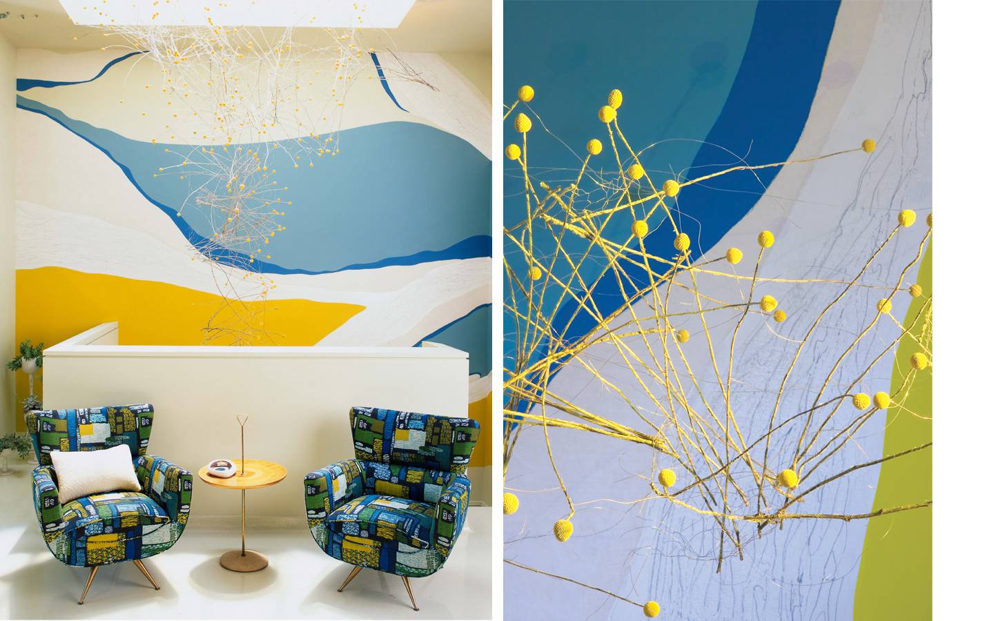 For the Kips Bay Showhouse, seven artisan collaborations yielded the likes of hand-loomed fabrics and custom enameling. Sculptor Kevin Inkawich’s botanical mobile of dried wildflowers hung from stainless wire.