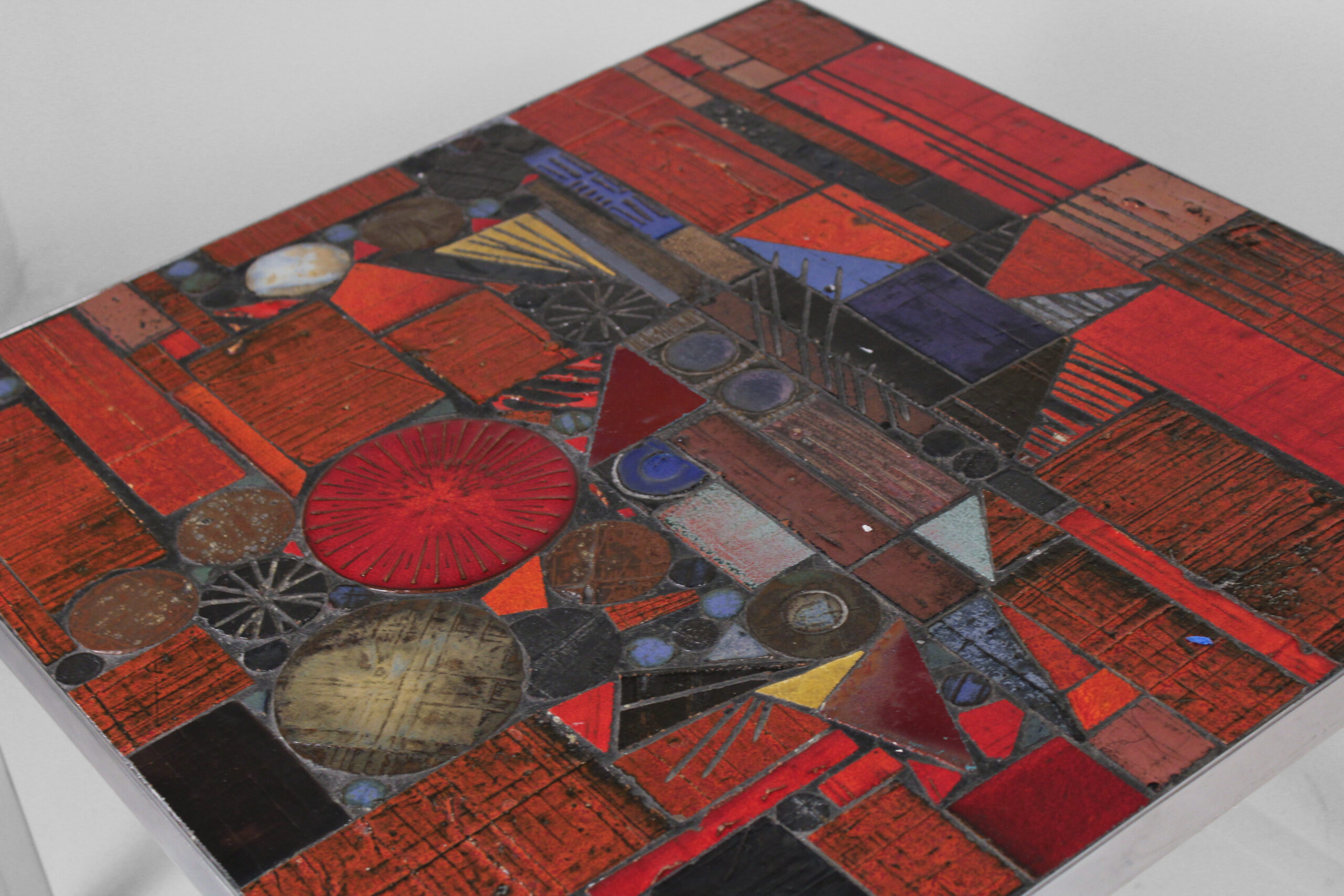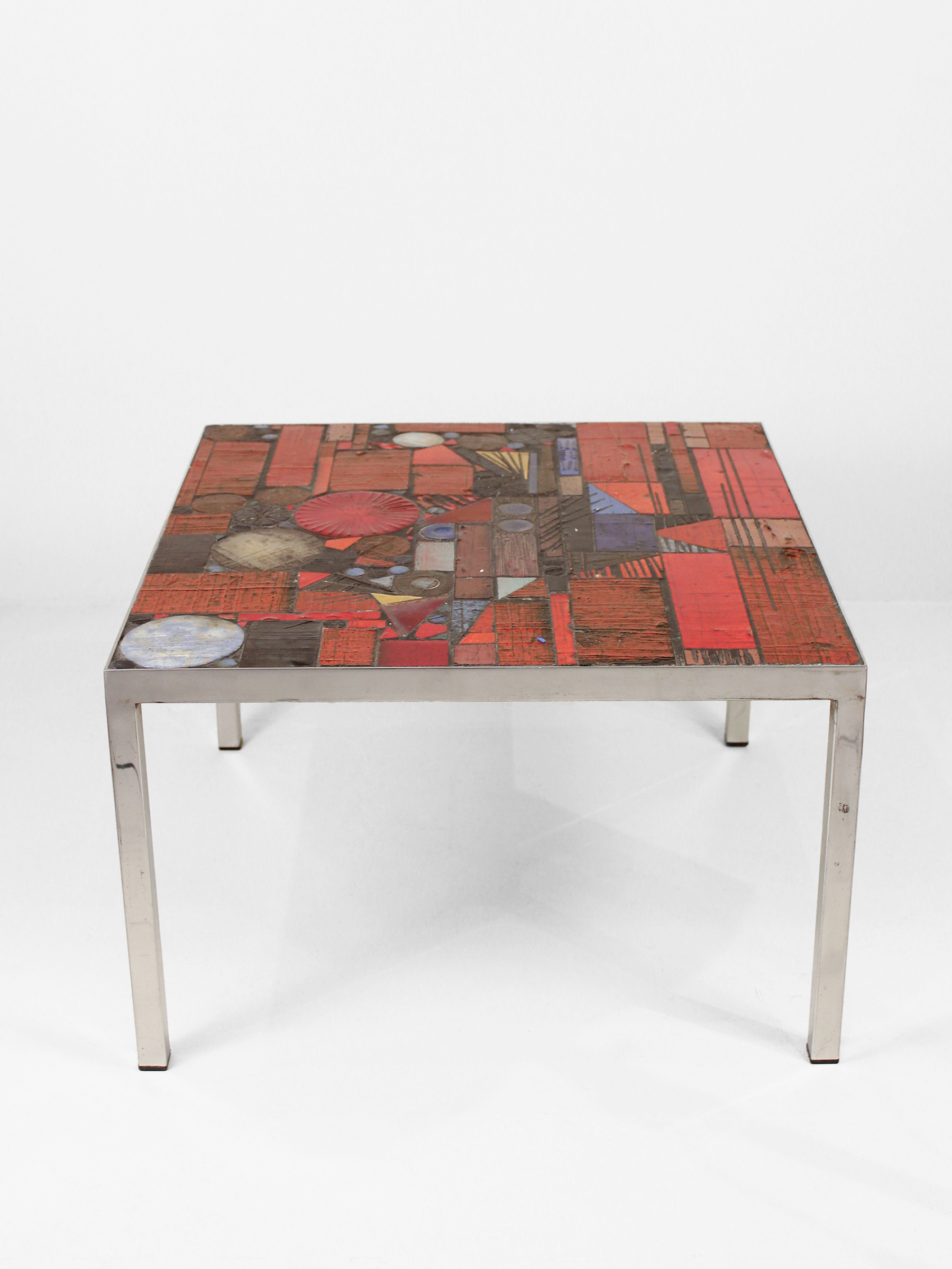 This piece presents a striking statement that fuses Brutalism and Modernism. Belgian designer, Jules Dewaele, created this vibrant ceramic table at his workshop Pia Manu (“a creative hand”). Dewaele had begun the 1960s working at Rogier Vandeweghe’s Amphora atelier near Bruges, Belgium, experimenting with innovative glazing treatments and firing techniques. The results demonstrate the success of his efforts. The table’s ceramic tiles — each one of a kind, with embedded reliefs — combine in a dramatic mosaic pattern.