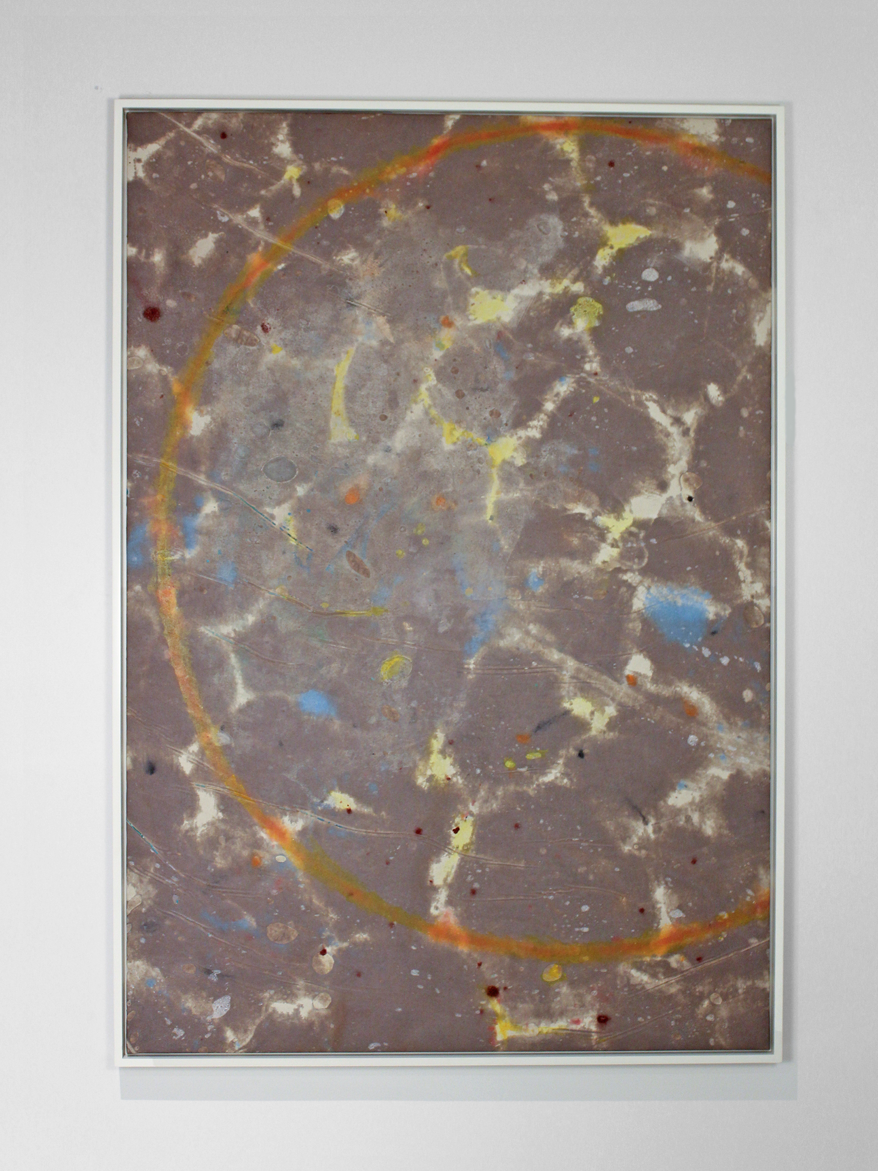 like matter in the purple toned painting and hollows filled with a wash of color that make them almost unnoticeable with a quick glance on the other painting. His control of color in the purple painting features an analogous color scheme that brings a sense of serenity. Where in contrast the grey toned painting plays with contrasting colors that add bright pops cueing the eye to explore the entire canvas. Even with contrasting color techniques Vander Sluis locks this diptych together by mirroring the same circular shape.