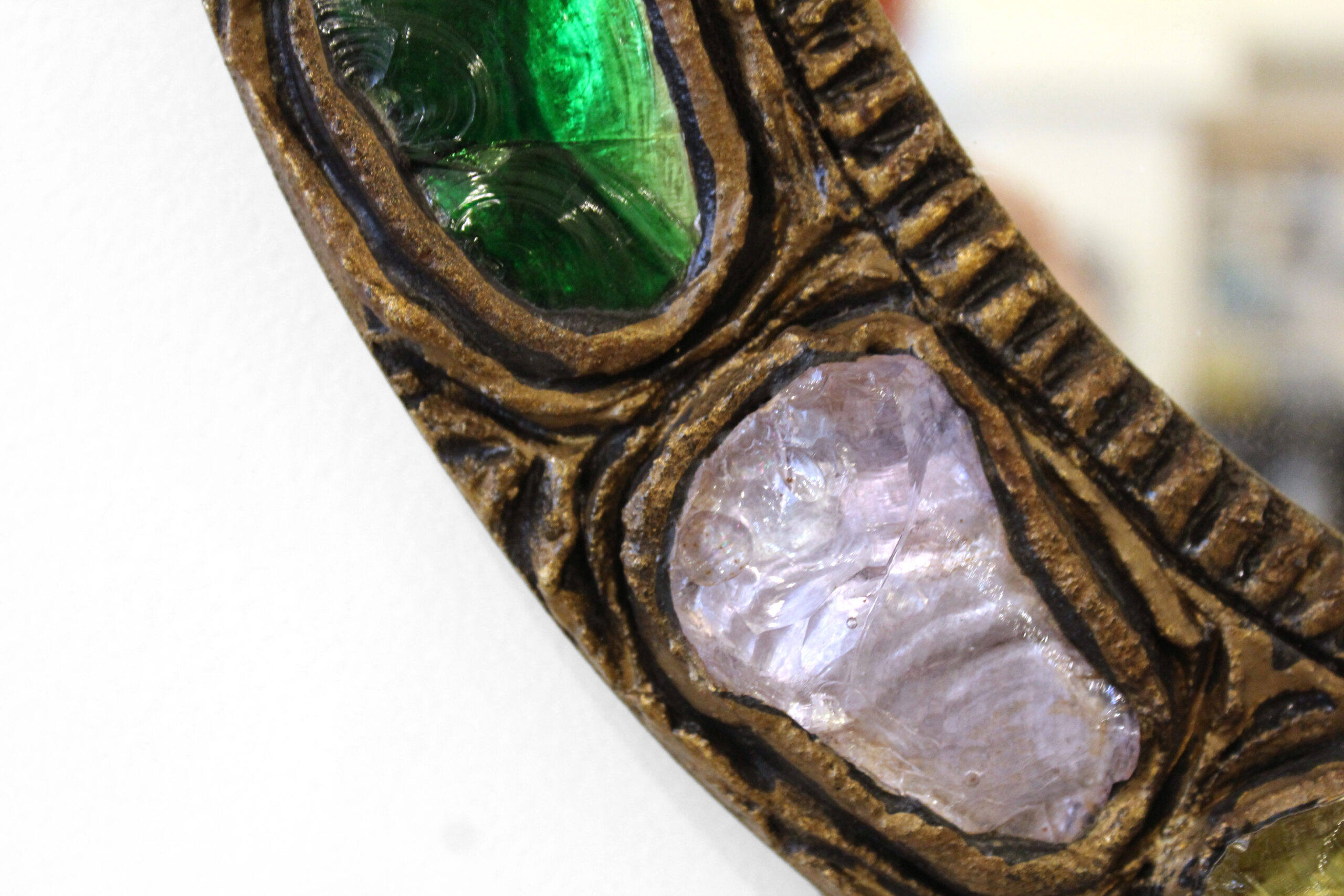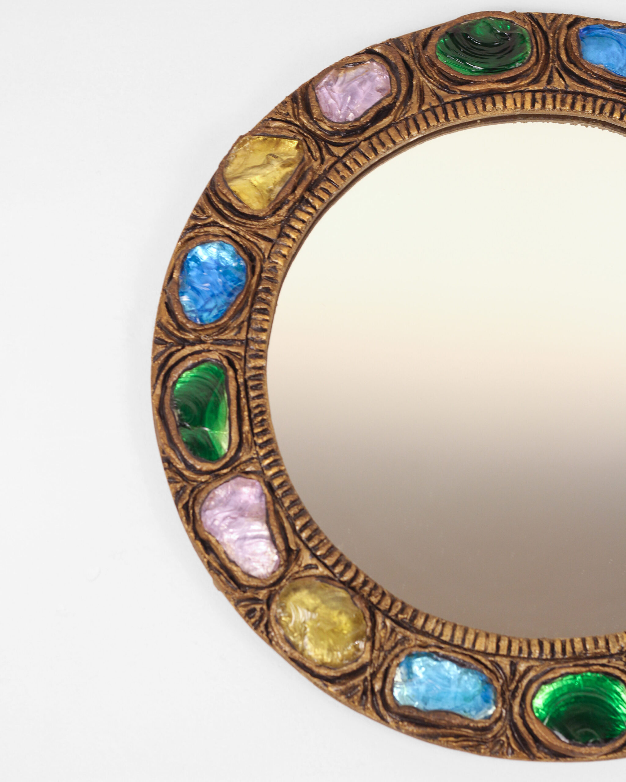 Fine glass from Murano has been cherished by collectors since 1291, when Venice banished its glassmakers to this neighboring island to prevent fires. By the 1960s and 1970s, the exclusive Murano maker, Creaciones Gobesso, was producing work in the spirit of iconoclastic French artist Line Vautrin, whose creations brought bolder, rough-finished designs. Thus Gobesso’s collection of glass boxes and mirrors takes a definitively Brutalistic tone. Here, outsize chunks of colorful handblown glass are studded into the mirror's resin frame, which displays a ruggedly scored, oxidized patina.