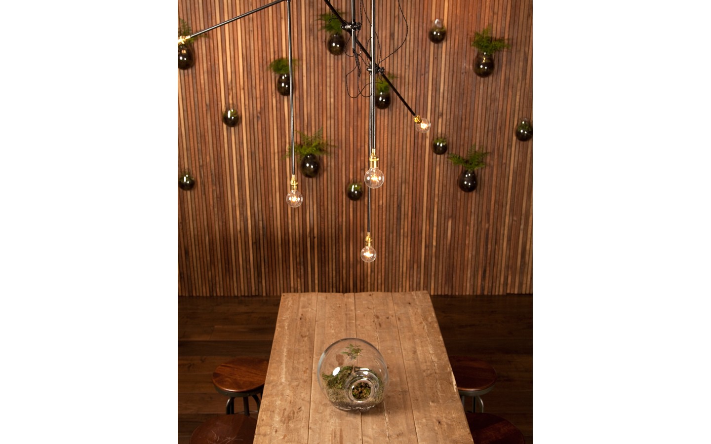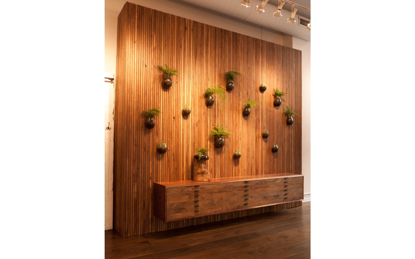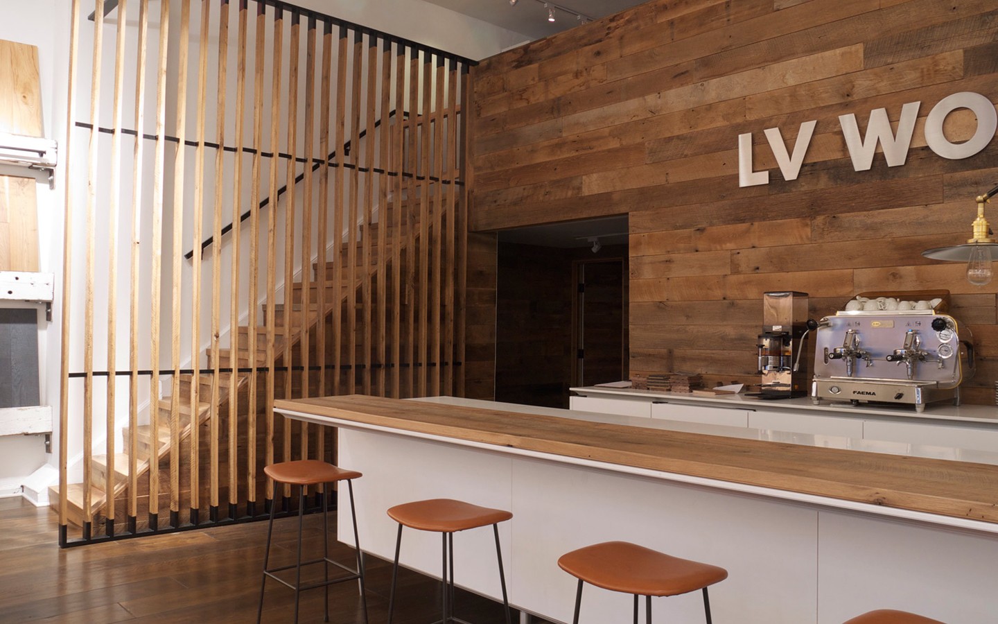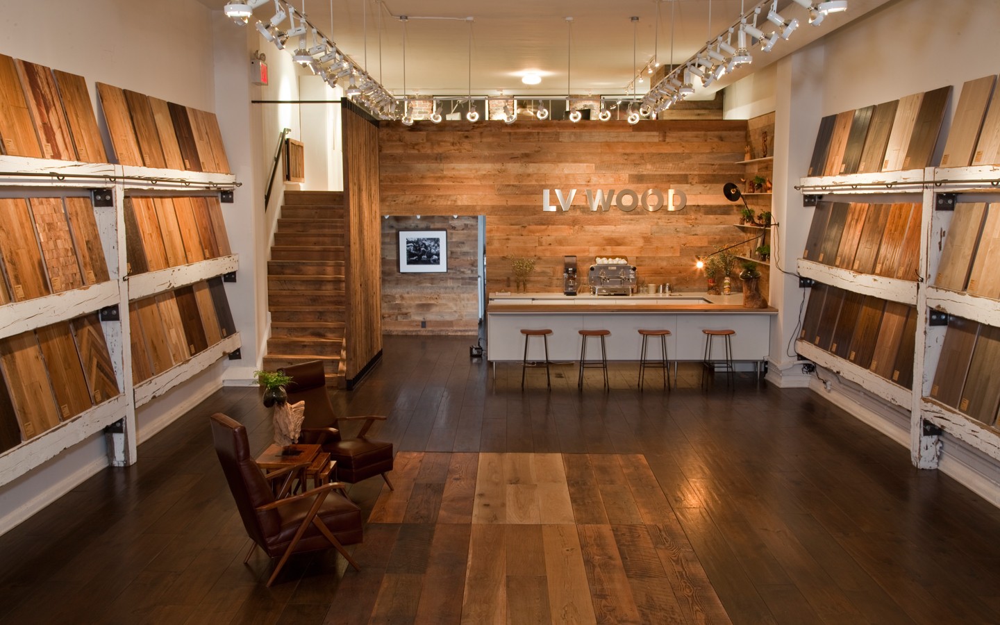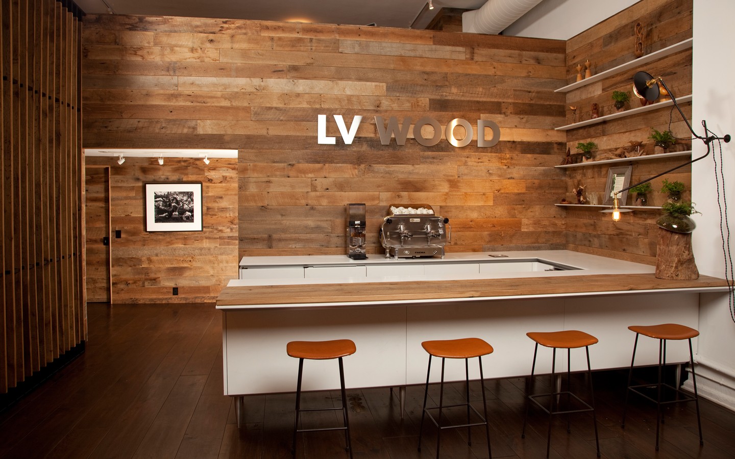 Unique use of reclaimed wood in a bespoke fashion with touches of modernist furnishings and foliage for the Flatiron District Flagship store of the design industry’s leader in heritage plank flooring, LV Wood.