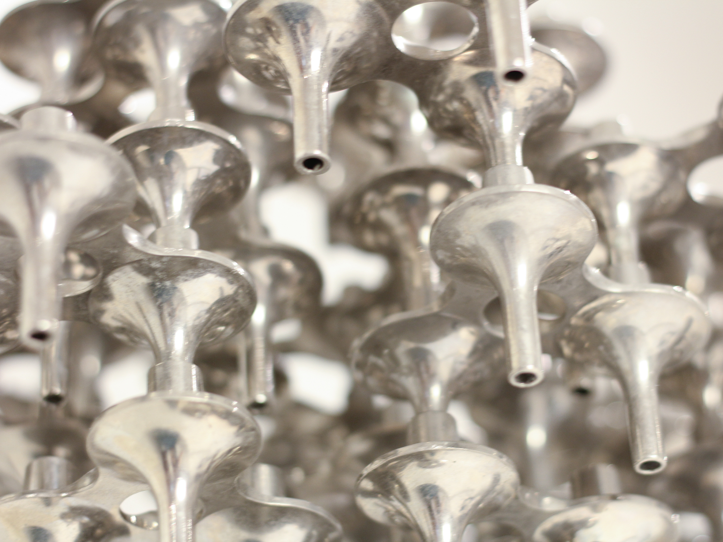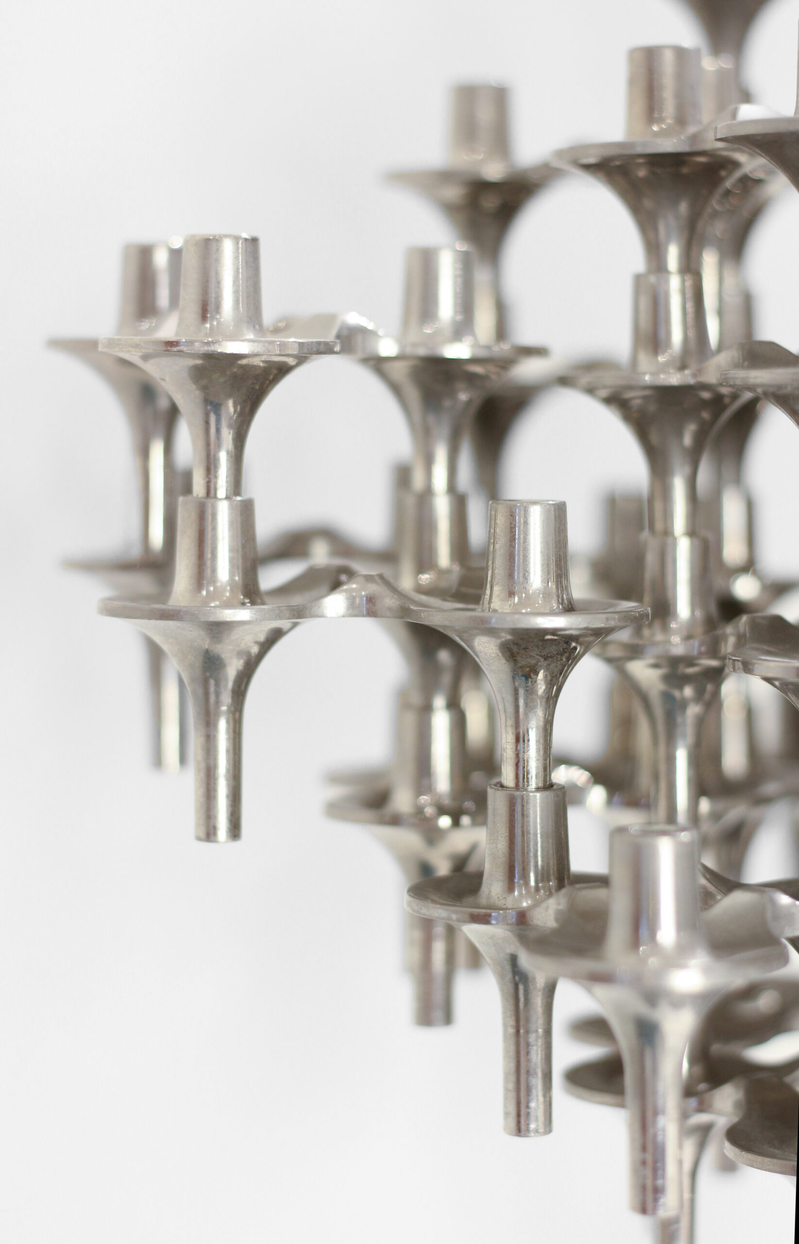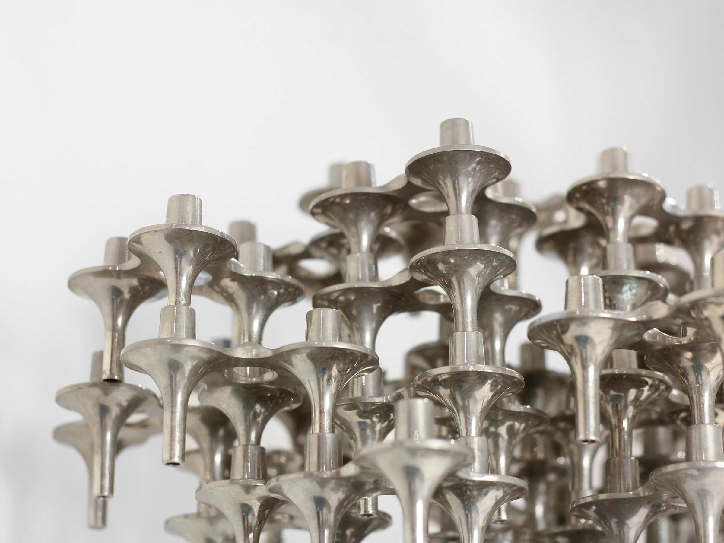 Founded in 1902 as a modest metal-working manufactory in Bavaria, Germany, Bayerische Metall Fabrik (BMF) became an international manufacturer of high-quality and luxury design elements for the home. Created by BMF designers Nagel and Stoffi in the 1960s, this modular assemblage of candleholders represents a particularly ingenious offering. Since each holder can interlock with others to make a multiplicity of forms, the owner helps shape the final design. Its Brutalist statement emerges from the turned-metal intricacy of its spindled cylinders, and from the sheer mass of the sculptural result.