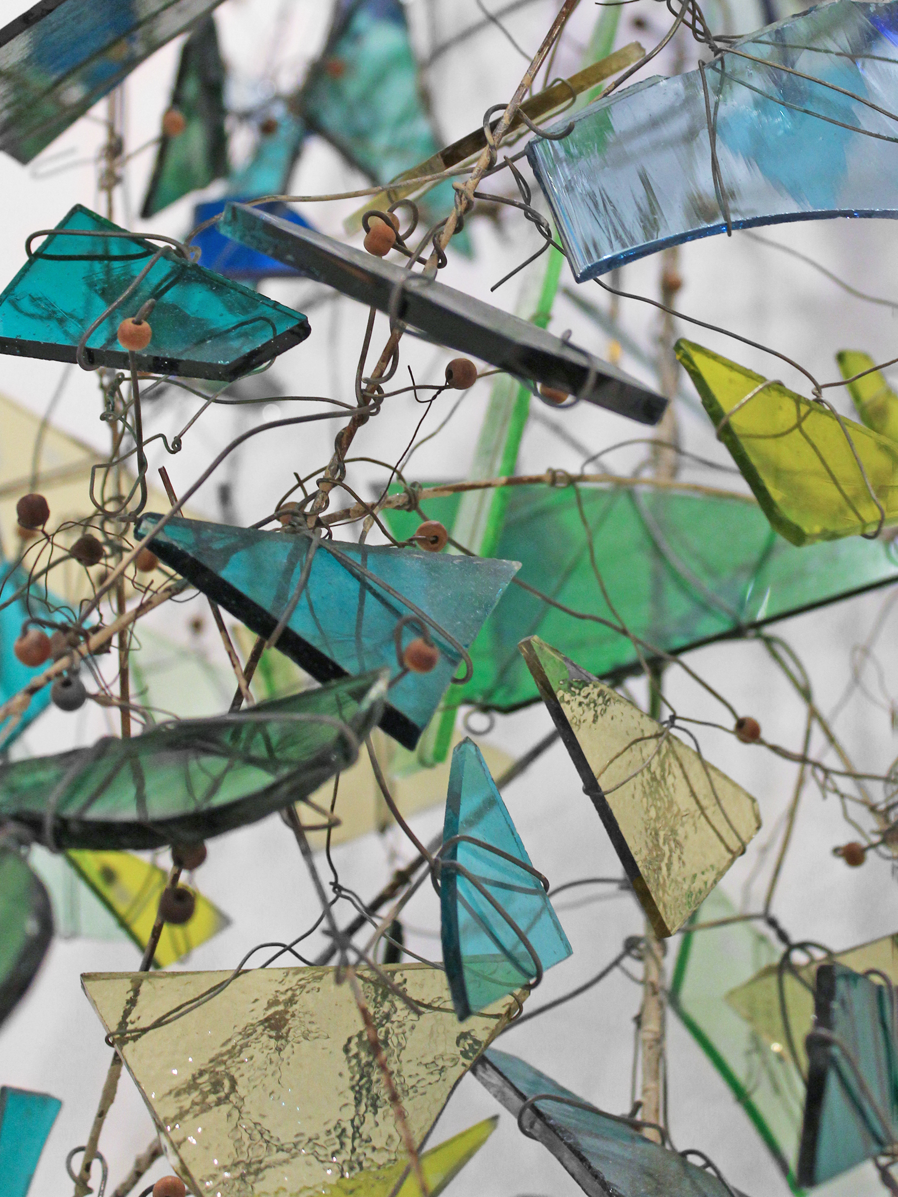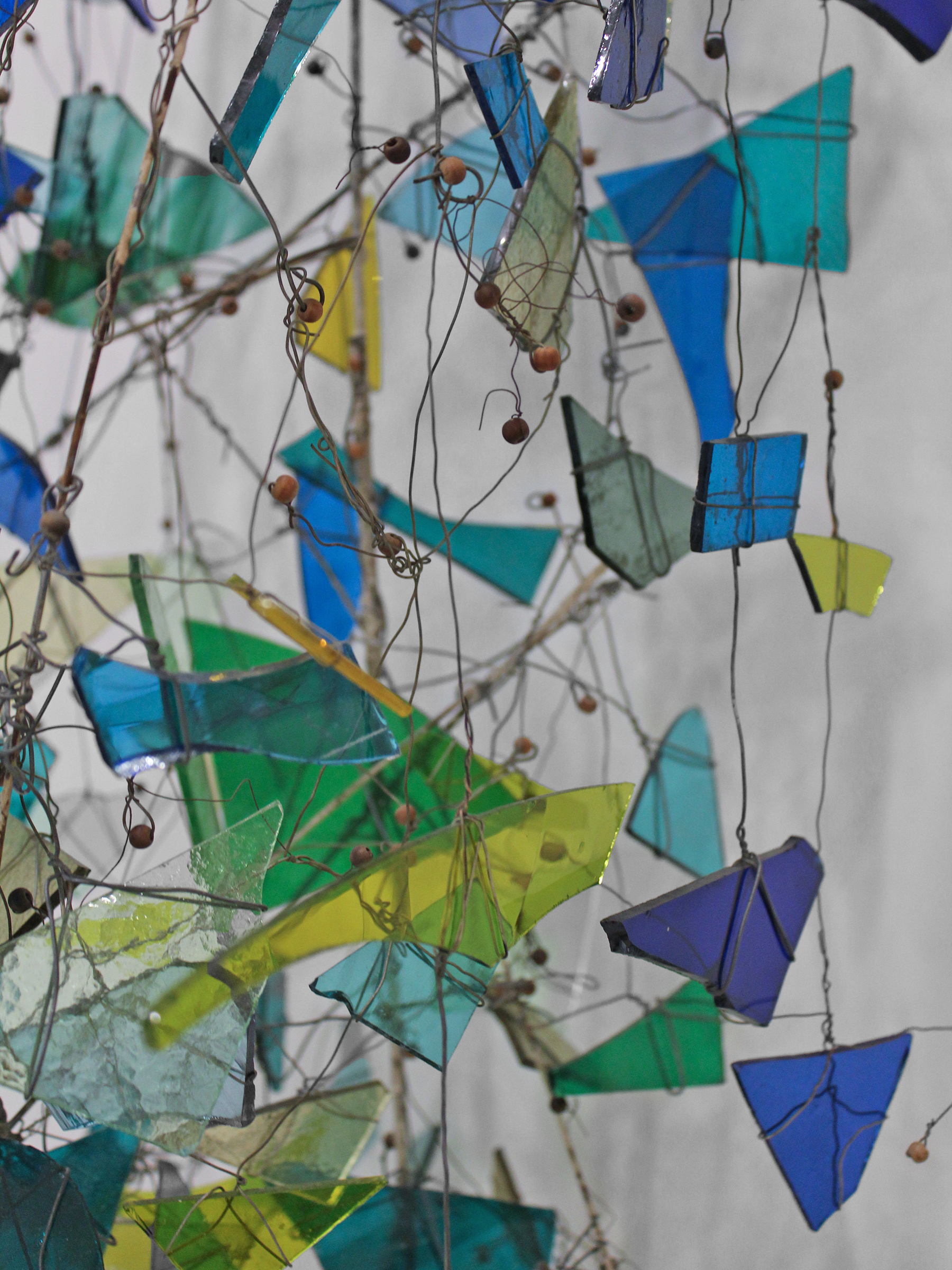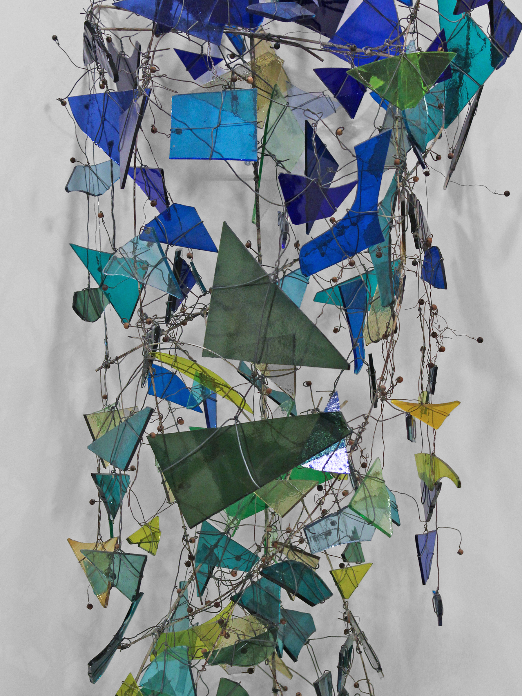 Leonard Nelson was a quiet force in the evolution of 20th-century American art. The figurative studies he produced in New York City in the 1940s helped shape Abstract Expressionism alongside Pollock, de Kooning, and Rothko. Nelson moved to Philadelphia in the 1950s. A new movement — the Philadelphia School — grew around him there, influenced by his innovative, luminous color-field canvases with their perceptual suggestions of landscape. This wall sculpture highlights Nelson’s decades-long explorations into the nature of color. Beautifully Brutalist with its tangled wires and sharp shards of glass, it grows organically upward in twists of blue, green, and yellow.