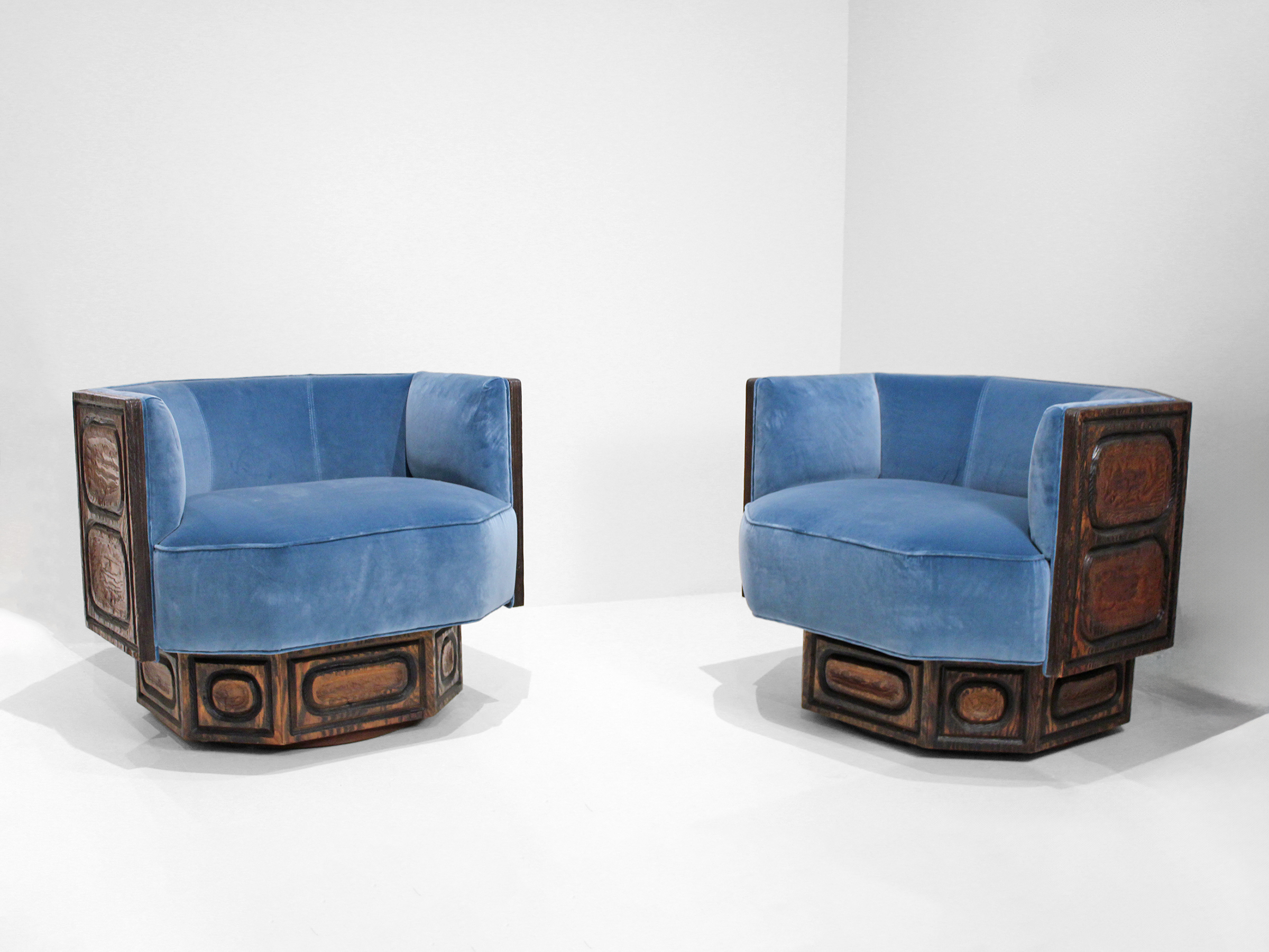 retrospectively realizing the aspects it shares with mainstream Brutalism. Here, abstract geometric forms in a special finish are carved from Pacific Northwest cedar to stand out from the darker, bold wood grain. These pieces have been archivally reupholstered in Dedar fabric.